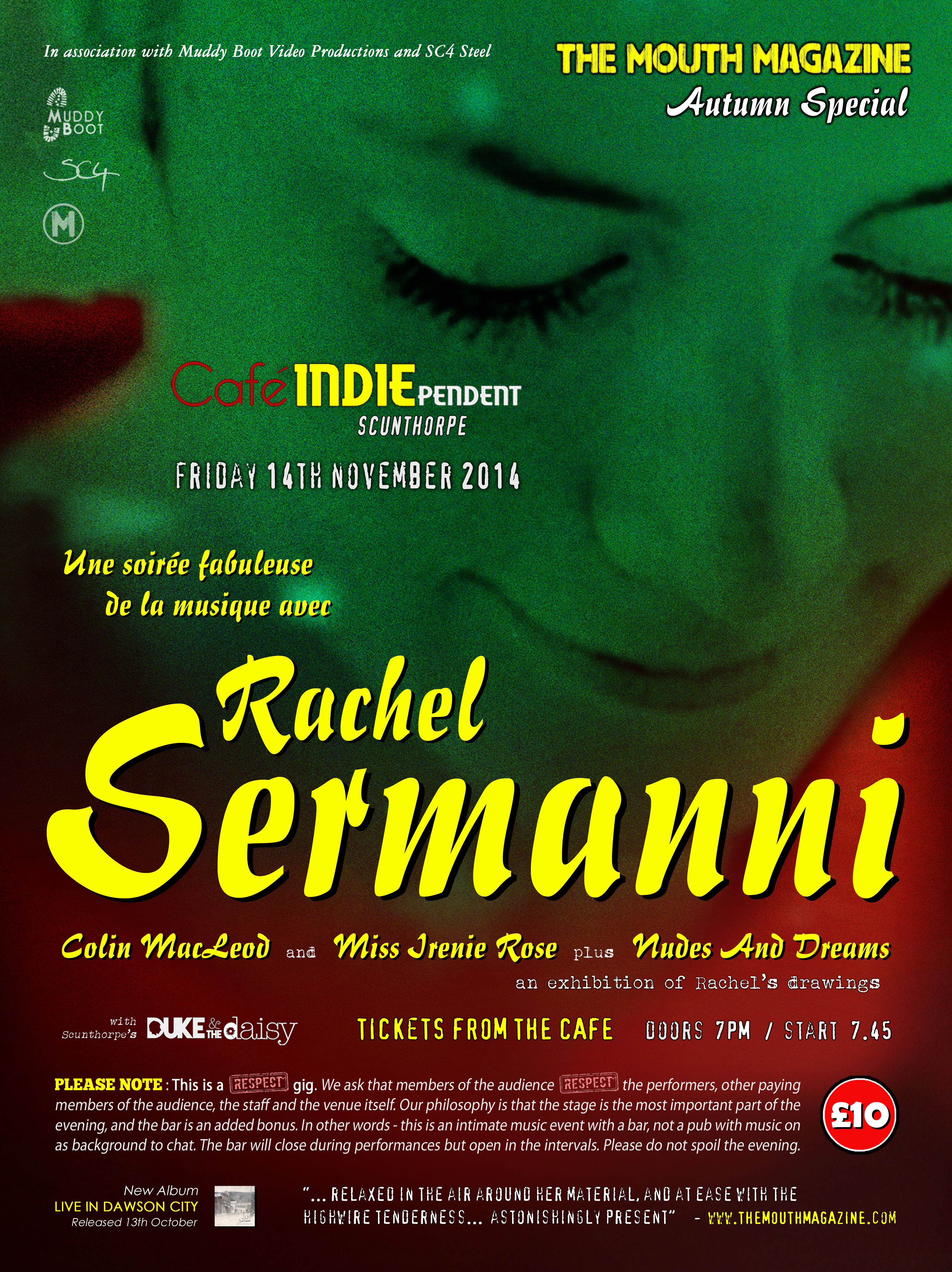 WE’RE PLEASED TO ANNOUNCE THE INAUGURAL LIVE EVENT TO BE STAGED BY THE MOUTH MAGAZINE – AND WE’RE ABSOLUTELY DELIGHTED TO REVEAL THAT THE HEADLINER IS CARRBRIDGE SONGWRITER RACHEL SERMANNI. OUR AUTUMN SPECIAL WILL TAKE PLACE AT CAFÉ INDIEPENDENT IN SCUNTHORPE, ON FRIDAY 14TH NOVEMBER.